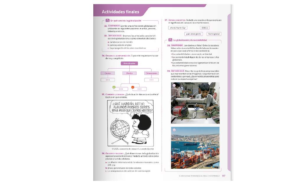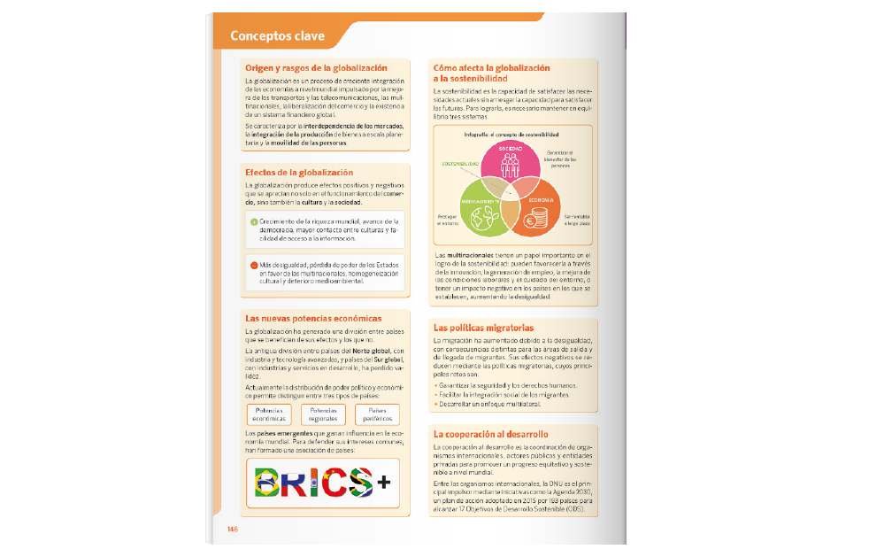 Explicaciones precisas y adecuadas al nivel de comprensión. Se incluye vocabulario y glosario de términos específicos. Teoría jerarquizada y apoyada en múltiples elementos visuales (gráficos, mapas, fotografías e ilustraciones) para facilitar la comprensión y la motivación.